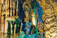 游览路线长500米。大约于60万年前由地下水冲刷、溶蚀而成,含何碳酸钙的滴水、流水与积水因水分挥发、二氧化碳重新沉淀,形成了千姿百态的钟乳石奇观。自洞顶垂下的一石乳,自地上向上生长的叫石笋。石乳与石笋连接成石柱,根据不同的形状还有石幔、石枝、石花、石瀑等;有一些石头中空,敲击时发出的声音清越人耳,又称石琴、石鼓、石钟;回乳石中所含方解石微粒反光,在洞内装饰灯光的照耀下,便会形成“钻石山”、“高峡飞瀑”等奇观。芦笛岩内共分为“石幔层林”、“天柱云山”、“水晶宫”以及“曲径画廊”四个洞天,有“狮岭朝霞”、“高峡飞瀑”、“原始森林”。“远望山城”、“盘龙宝塔”筹20处景点。著名文学家邓拓在游完芦笛岩后曾这样写道:“满目琳琅的红、绿、黄、白多种颜色的钟乳石,构成了这个神话世界的万般奇景。整个洞府像全部是用宝石、珠翠、珊瑚、象牙、绸缎和脂粉堆积起来的,简直和神话传说中的阆苑仙富一样。” |