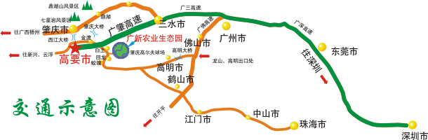 | 现代人工作、学习忙碌,每天熙熙攘攘在钢筋森林中,心中多渴望有一片乐土:蔚蓝的天空,清澈的湖水,芳草萋萋绿树成荫,和家人、朋友一起置身于瓜熟果香之中,远离尘器,到处鸟语花香,身心自由、自在,完全溶入大自然之中,这是多么美妙的事啊!广新农业生态园正是这样一个好去处,她让人们忘记烦忧,回归大自然,被誉为现代都市人的后花园 | 路线: ·A)珠海市——中山市——江门市——鹤山市——杨梅——人和——明城——新圩——蛟塘——回龙——生态园 ·B)广州市—广佛高速—佛山市--[佛开高速]——九江、高明出口处—[高明大桥]—高明市——人和——明城——新圩——蛟塘——回龙——生态园 ·C)广州市—[广三高速]—三水市——四会市——鼎湖——肇庆市—[西江大桥]—高要市——金渡——白土——生态园 肇庆市桥西车站315专线公共小巴直达生态园,每隔20分钟一班,途径南岸、金渡、肇江公路、清湖. 广肇高速公路正式通车,广州至高要市白土出口处约40分钟车程. |